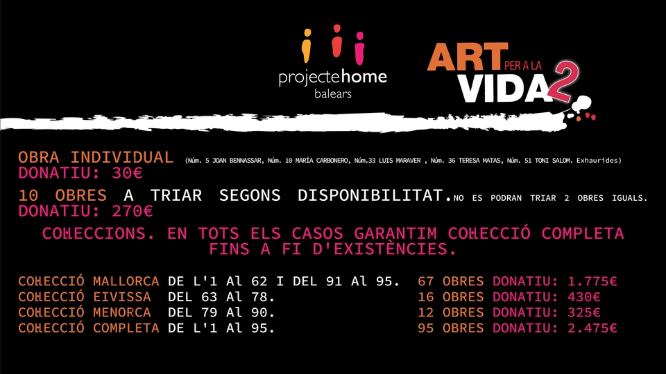 "Múltiples visions de la plàstica artística de les illes balears es sumen a Projecte Home en una mostra solidària que té dos objectius: servir de catàleg dels moviments pictòrics que avui marquen la pauta i ajudar de manera altruista a Projecte Home Balears a continuar amb la seva tasca de tractament, prevenció i investigació en el món de les addiccions.”